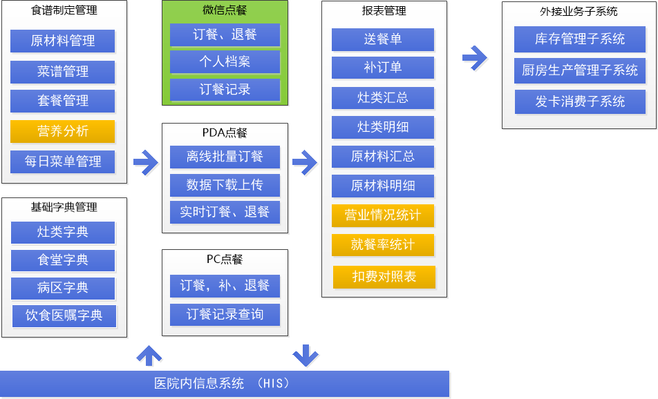 采用PDA或平板点餐,无纸化,自动根据饮食医嘱匹配灶类,数据可追溯,降低出错率